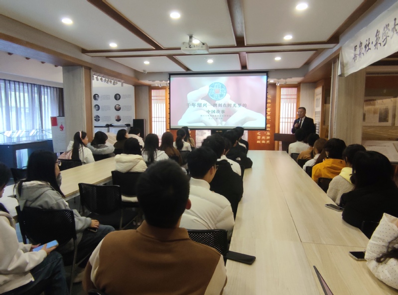 参观结束后,陈宝祥馆长以《钱币与绍兴——钱币中的绍兴2500年历史文脉》为题开展专题讲座。作为浙炉花钱领域资深藏家、高级经济师,陈馆长以越国戈币、唐会昌开元通宝背“越”、南宋绍兴元宝与通宝三枚标志性钱币为脉络,串联起绍兴2500余年的历史文脉,解读了绍兴地名的沿革与“绍祚中兴”的历史渊源。同时,他从货币起源、泉学由来、货币与钱币的概念区分,到御书钱币的书法艺术等专业角度展开阐释,将金融知识普及与历史文化传播有机结合,让同学们深刻领略小小钱币中承载的厚重历史与文化内涵。讲座中,陈馆长“钱币守护人、文化传播者”的使命担当,更激发了同学们传承传统文化与金融文化的责任感。现场同学纷纷表示,此次研学活动将金融专业特色与绍兴本土文化深度融合,不仅系统了解了钱币背后的金融知识与历史故事,更增进了对第二故乡绍兴的认同感与归属感,未来愿成为金融文化与绍兴文脉的双重传播者。
